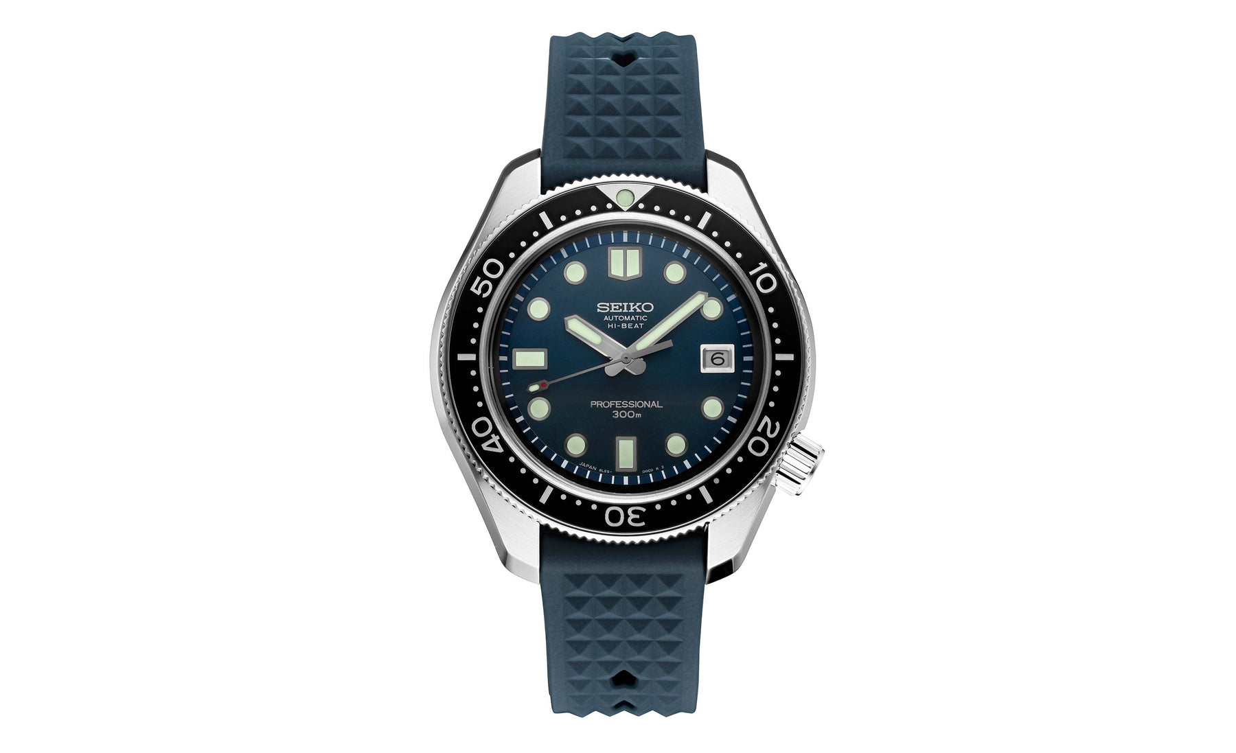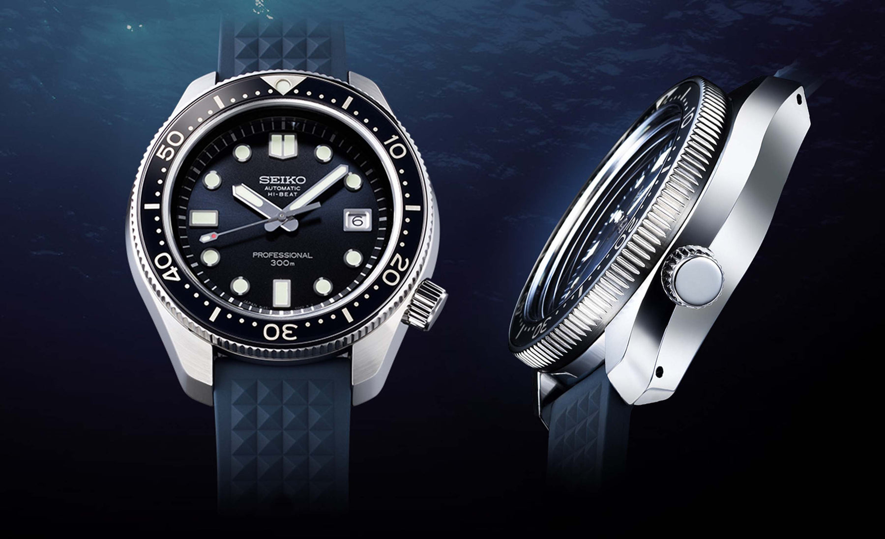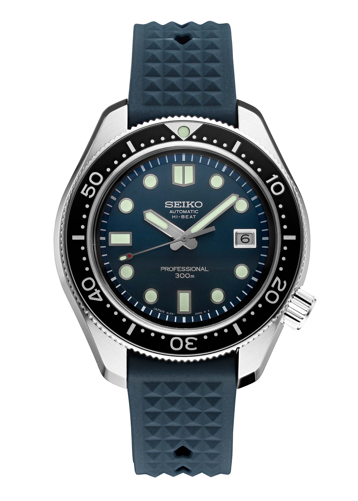 1968 Diver's Watch Recreation Limited Edition. Designed for those who treat life as the ultimate adventure, the Seiko Prospex line meets every challenge with technological excellence and style. Part of a rich legacy of innovation in high-intensity timekeeping, Prospex continues to celebrate a long history of sports watch excellence with recreations and reinterpretations of landmark achievements. Marking the 55th anniversary of Seiko's first diver's watch by recreating 1968's Hi-Beat, one-piece case, saturation diver, this extraordinary timepiece is available only in a limited edition of 1,100, with the serial number engraved on each caseback. Upgraded with a dual-curved anti-reflective sapphire crystal, it is crafted of Seiko's new Ever-Brilliant Steel, offering an exceptional level of corrosion resistance and a lighter, brighter finish. The rich blue-gray dial, designed to suggest the ocean depths at the point at which blue yields to darkness, features a date calendar and LumiBrite hands and markers. Following ISO standards for diving to depths of up to 300 meters, this saturation diver includes a black one-way rotating elapsed timing bezel, screwdown crown, and secure silicone strap, also in oceanic blue-gray. The proprietary hi-beat, 37-jewel, caliber 8L55 automatic movement, assembled expressly for diver's watches at the Shizukuishi Watch Studio, beats at a frequency of 36,000 vibrations per hour, with a power reserve of approximately 55 hours, and can be wound manually or automatically. 300m Water Resistant.