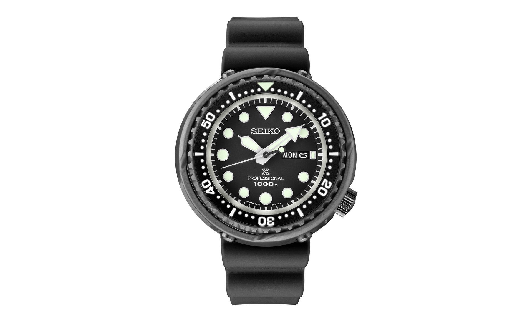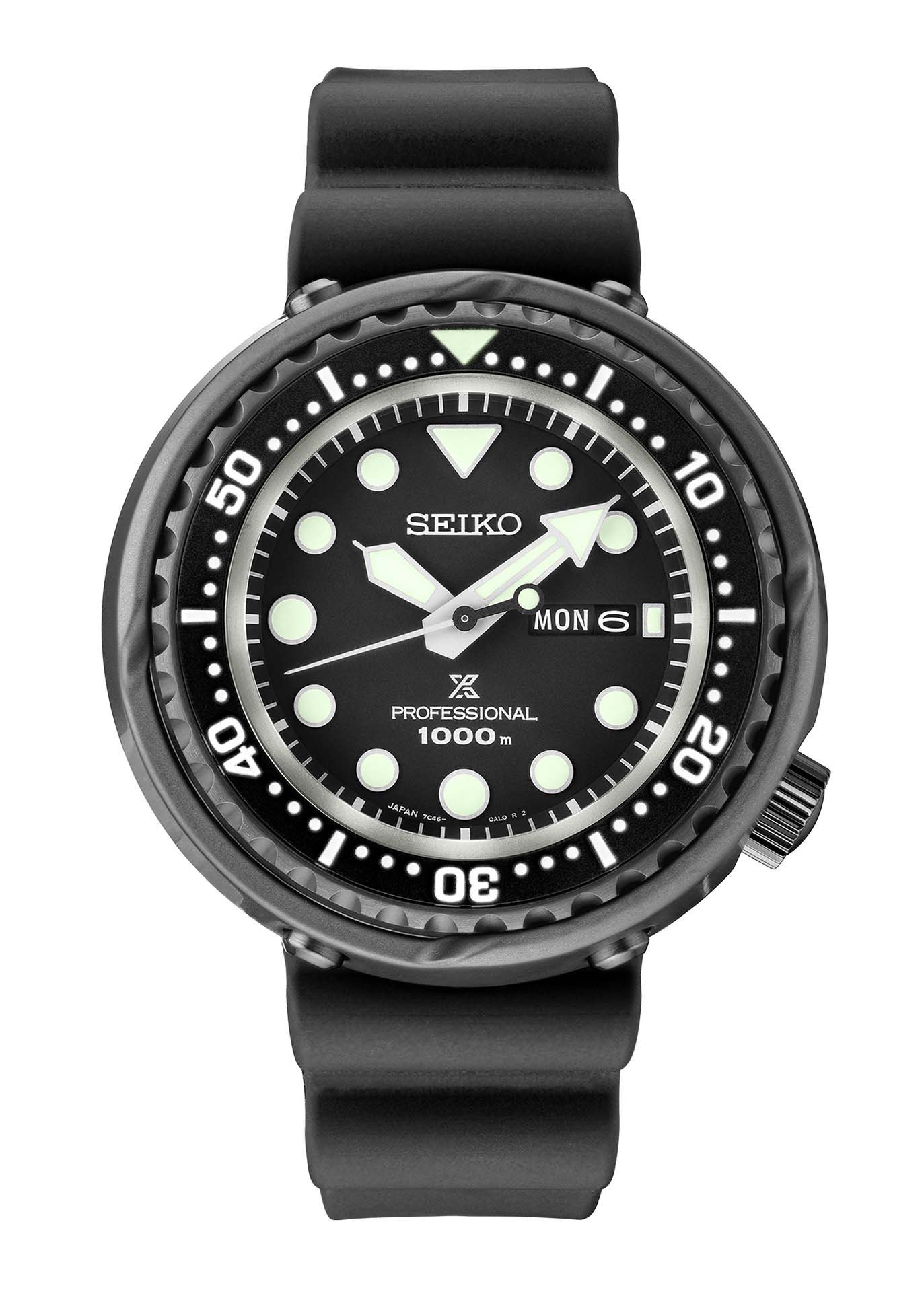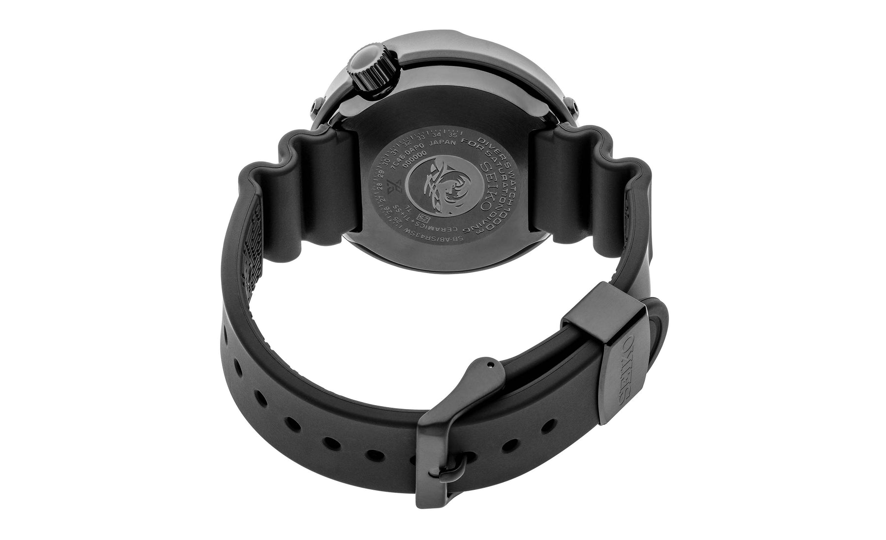 1975 Saturation Diver's Watch Reinterpretation. Designed for those who treat life as the ultimate adventure, the Seiko Prospex line meets every challenge with technological excellence and style. Part of a rich legacy of innovation in high-intensity timekeeping, Prospex continues to celebrate a long history of sports watch excellence with recreations and reinterpretations of landmark achievements. Honoring the first watch designed to withstand the dangerous world of the professional diving, Seiko's 1975 saturation diver, with its one-piece case, outer shroud and revolutionary L-shaped protective gasket, this extraordinary reinterpretation retains the solid can-like lines and functionality of the original, improved with upgraded specifications and materials. Following ISO standards for diving to depths of up to 1,000 meters, this powerful saturation diver features a one-piece inner case in light and durable titanium, as well as a ceramic outer case. The one-way rotating elapsed timing bezel is crafted of stainless steel with black super-hard coating. Arrow shaped minute hands, simple geometric indices, narrower bezel markers and LumiBrite enhancement offer sharper legibility, while the sapphire crystal provides improved scratch resistance. With secure screwdown crown, silicone strap and day/date calendar, this updated design is powered by a unique extended-life quartz battery with increased torque, engineered specifically for diver's watches. 1,000m Water Resistant.