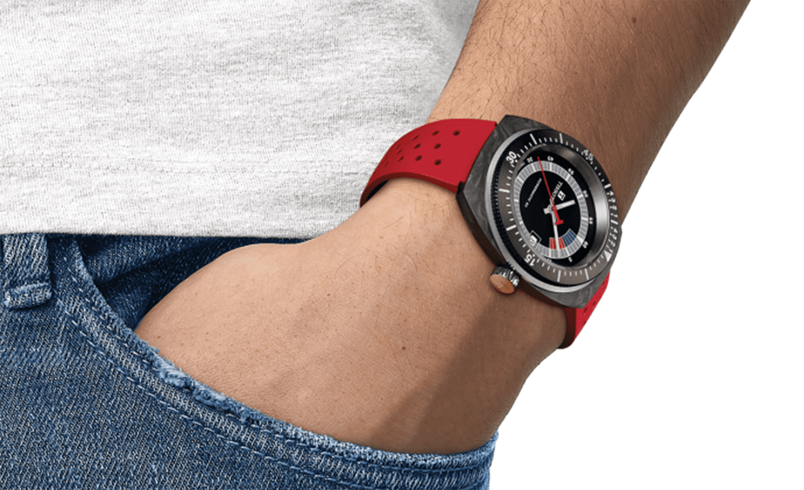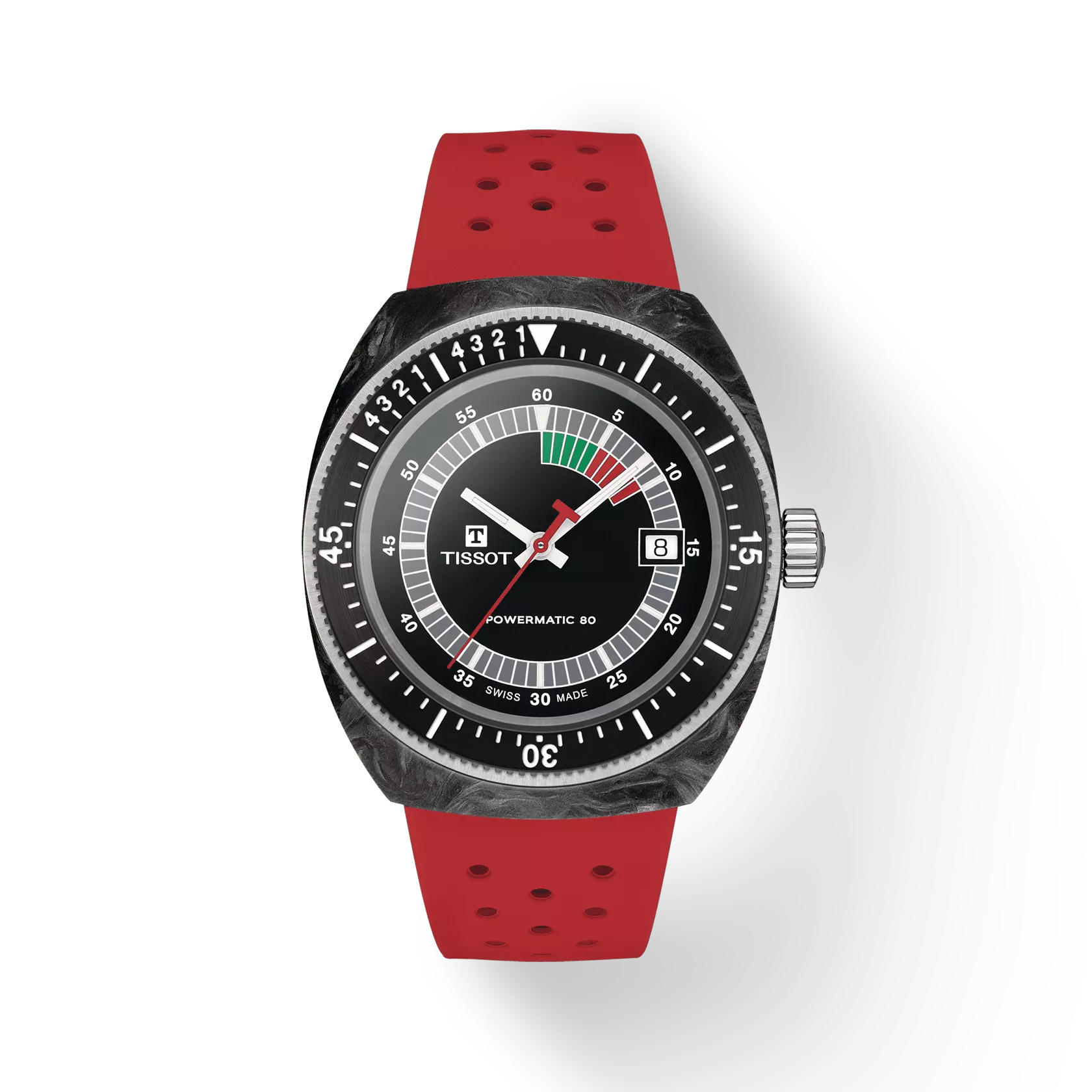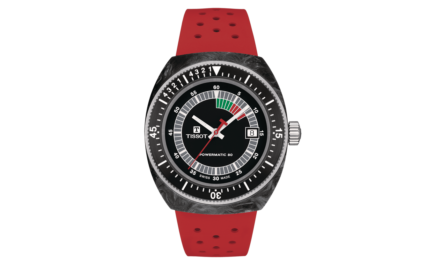 Discover the Tissot Sideral, a captivating fusion of vintage allure and modern craftsmanship. The watch features a 41mm wide forged carbon case and a bold red strap. The dial presents a multi-colored luminescent animation, amplifying its distinct appeal. Water-resistant up to 30 bar (300 meters) and equipped with Super-LumiNova® coated indices, the Sideral is a statement piece for trendsetters and history enthusiasts. Effortlessly modify your look with the interchangeable perforated rubber strap. Make a statement with the Tissot Sideral.