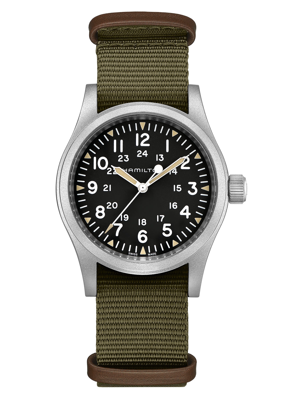 38mm matt stainless steel case, three hand display, dark dial with light, luminescent numerals, indexes showing hours and minutes, durable NATO strap: The new Khaki Field Mechanical is a faithful recreation of its original 1960s forebear and is true to Hamilton’s military heritage. Inspired by the military, built to last, this is the original soldier’s watch.
