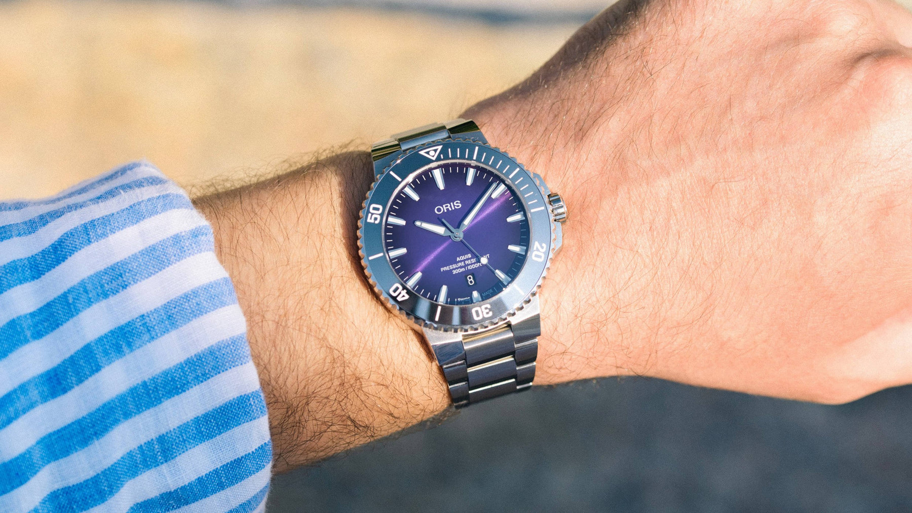 The dial of the Aquis Date “Taste of Summer” 43.50 mm is inspired by the crepuscular light that lingers into the mid-summer night in the Waldenburg Valley where Oris watches are made. Behind it, the evergreen Aquis Date, our versatile dive watch.