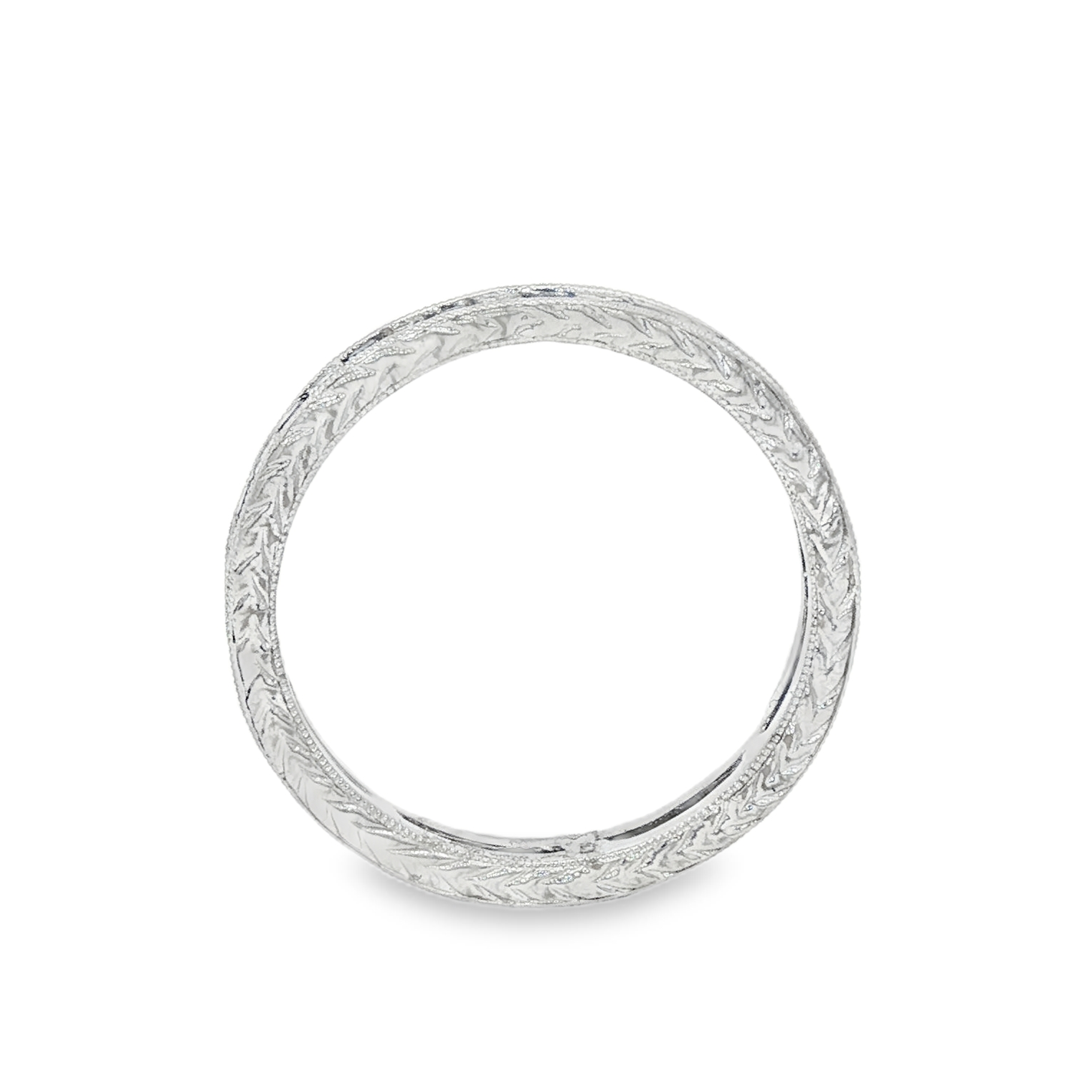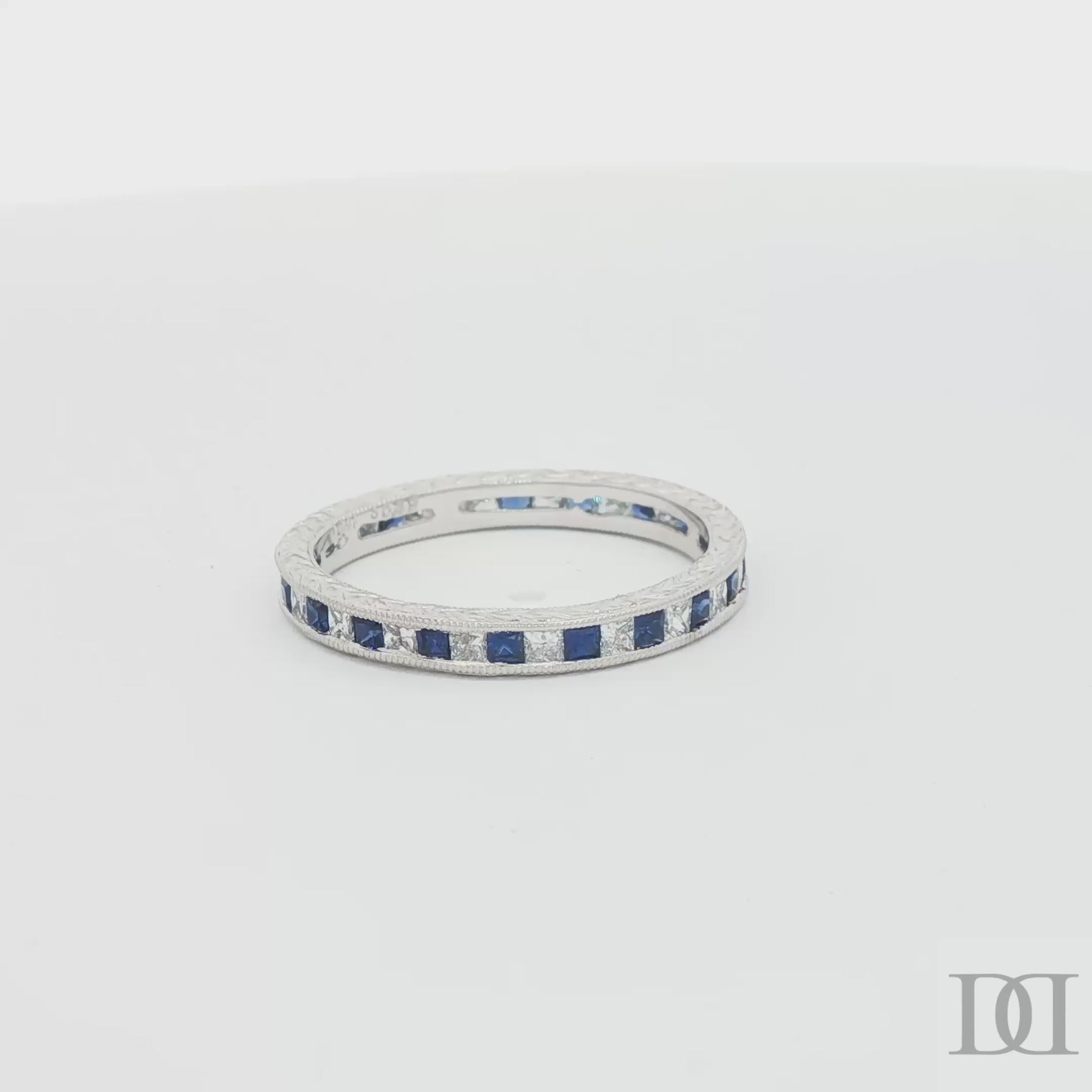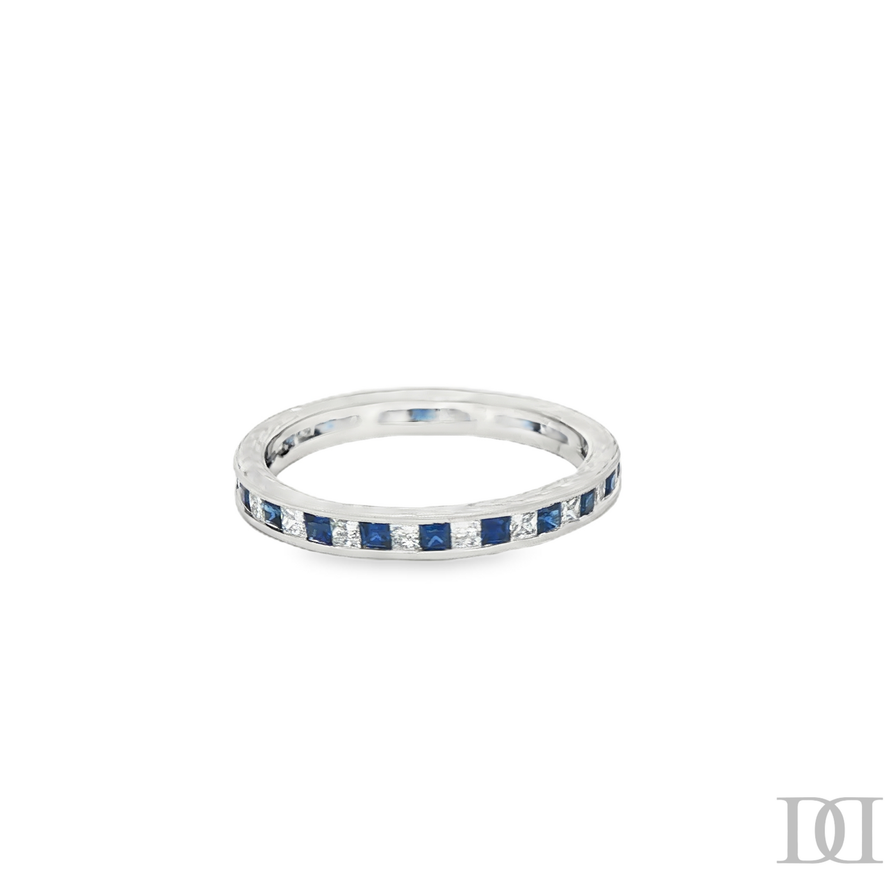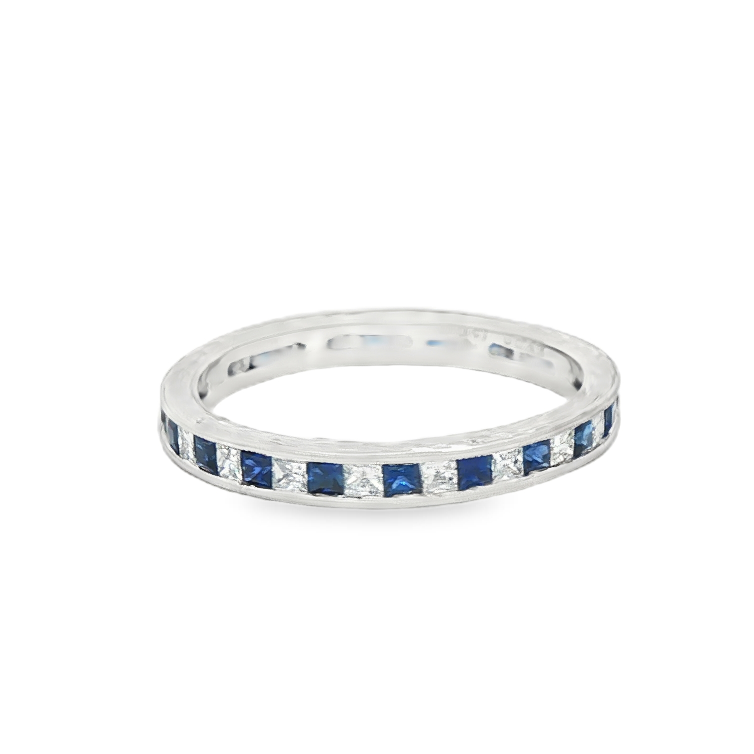 Exquisite Platinum eternity band featuring a continuous row of square princess-cut deep blue sapphires and diamonds. Each gemstone is meticulously set within the intricately engraved band, showcasing fine craftsmanship and timeless elegance. The ring's composition and arrangement highlight the captivating brilliance and color of the vibrant sapphires, making it a truly sophisticated piece of jewelry. Size 6