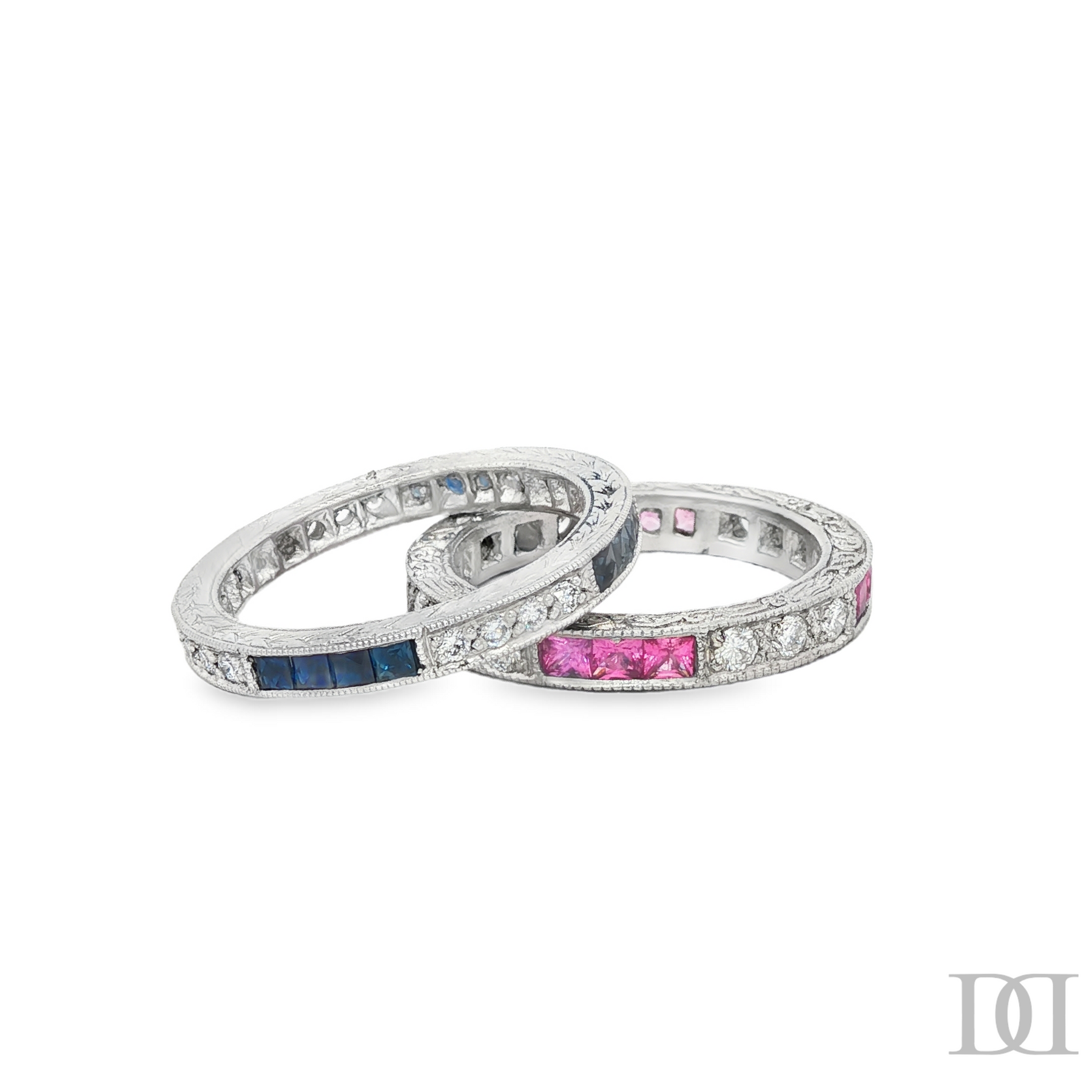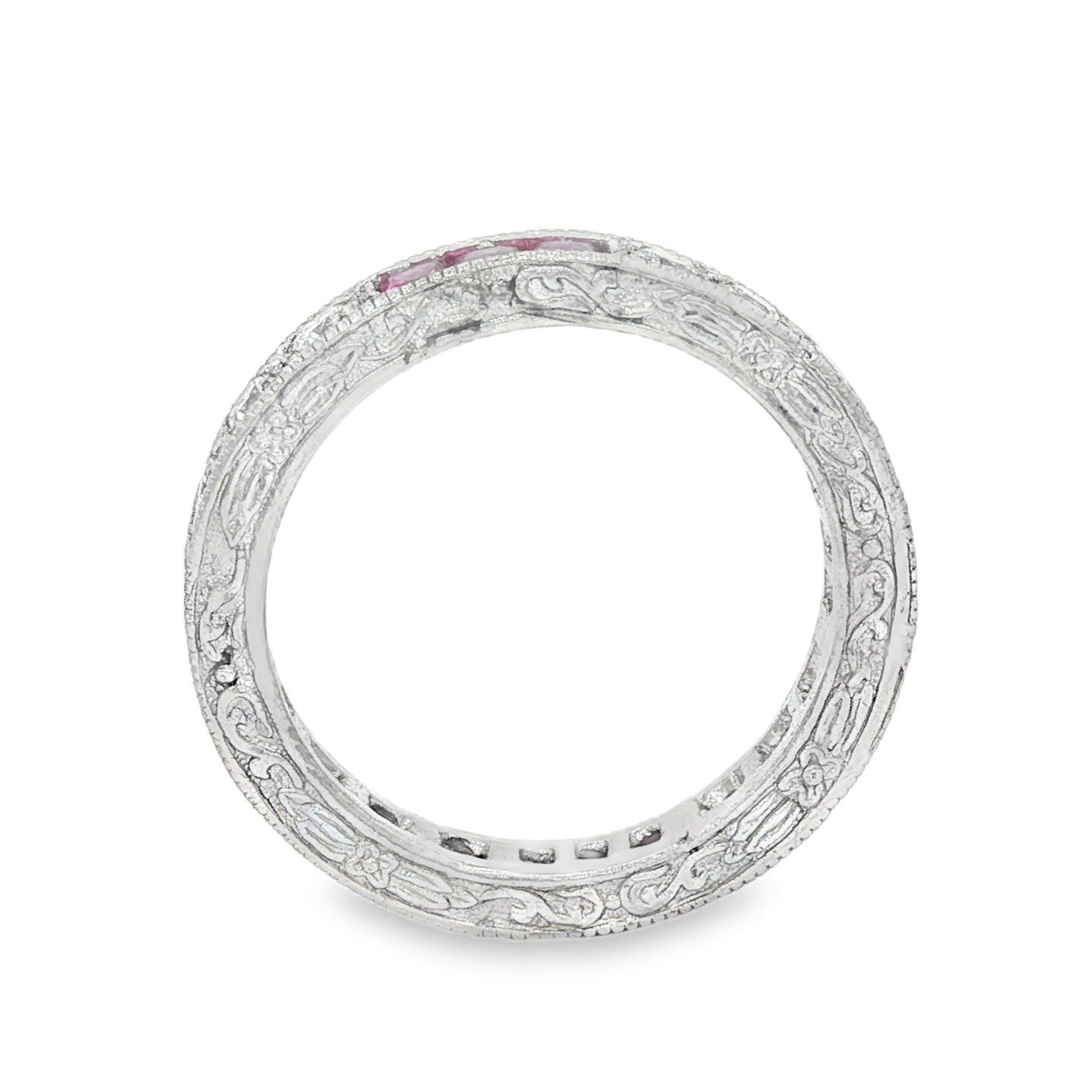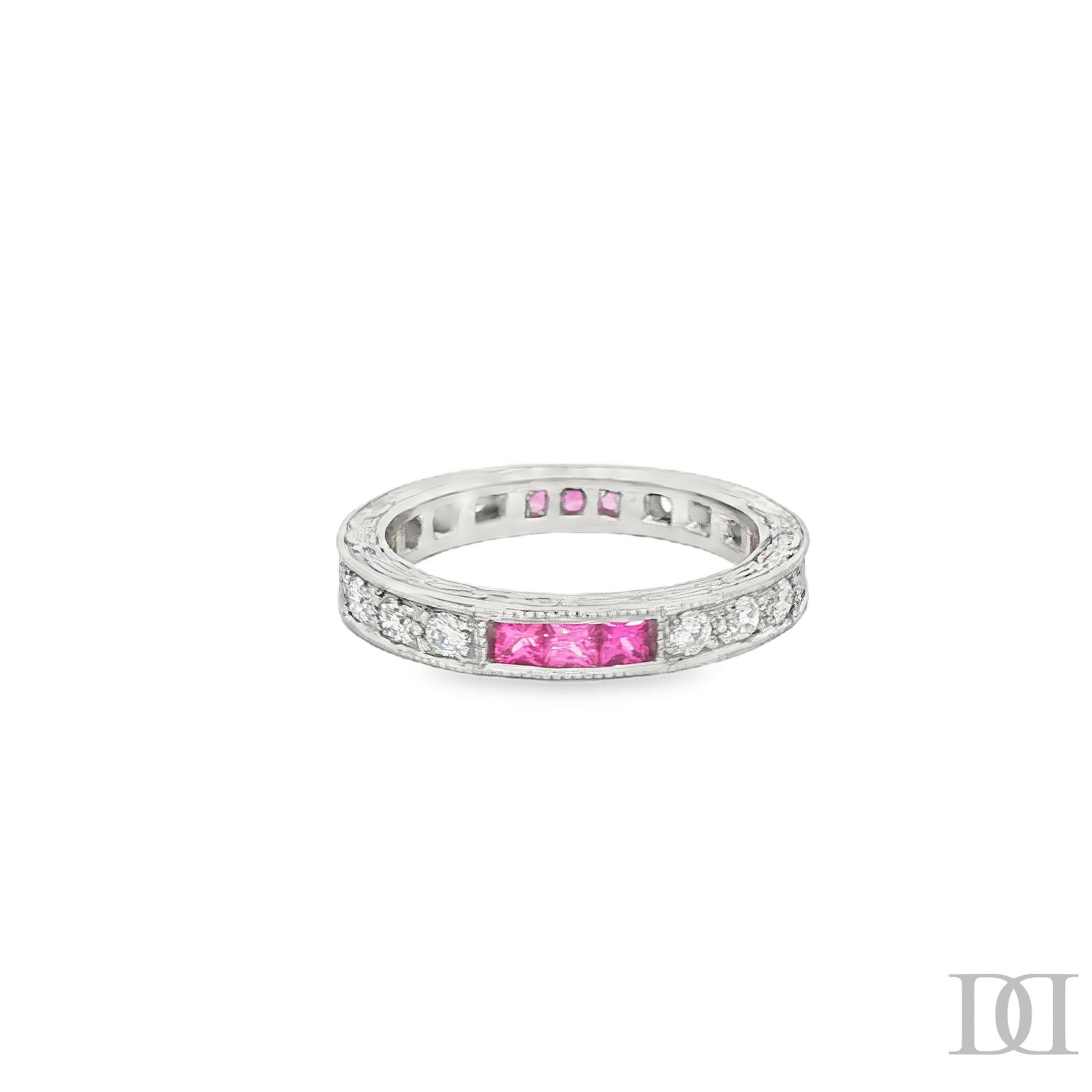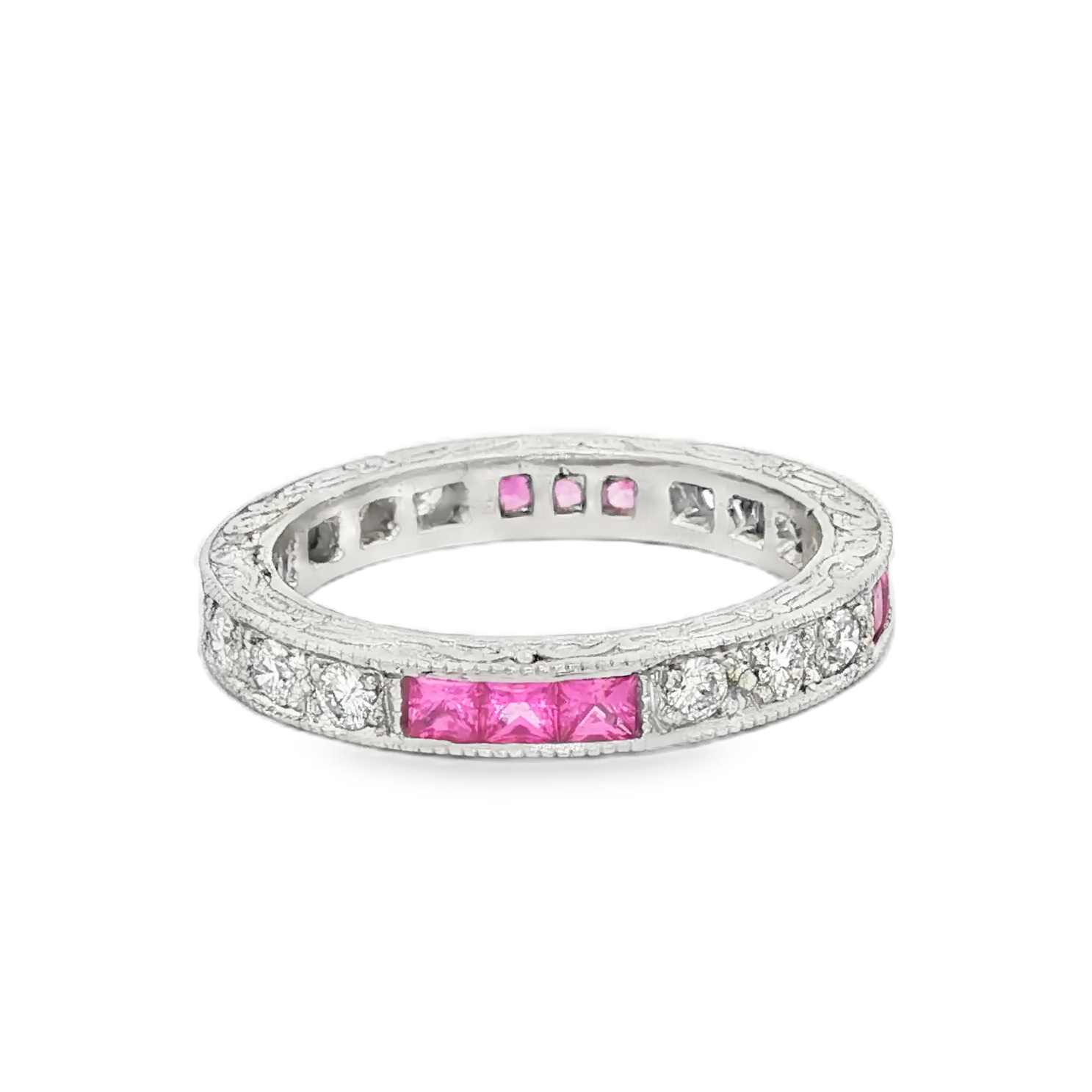 Exquisite platinum eternity ring showcasing a captivating row of square princess-cut gleaming pink sapphires, complemented by brilliant-cut diamonds. The band features delicate engravings, adding a touch of vintage-inspired charm. This ring combines classic elegance with timeless design, perfect for celebrating everlasting love or a special milestone.